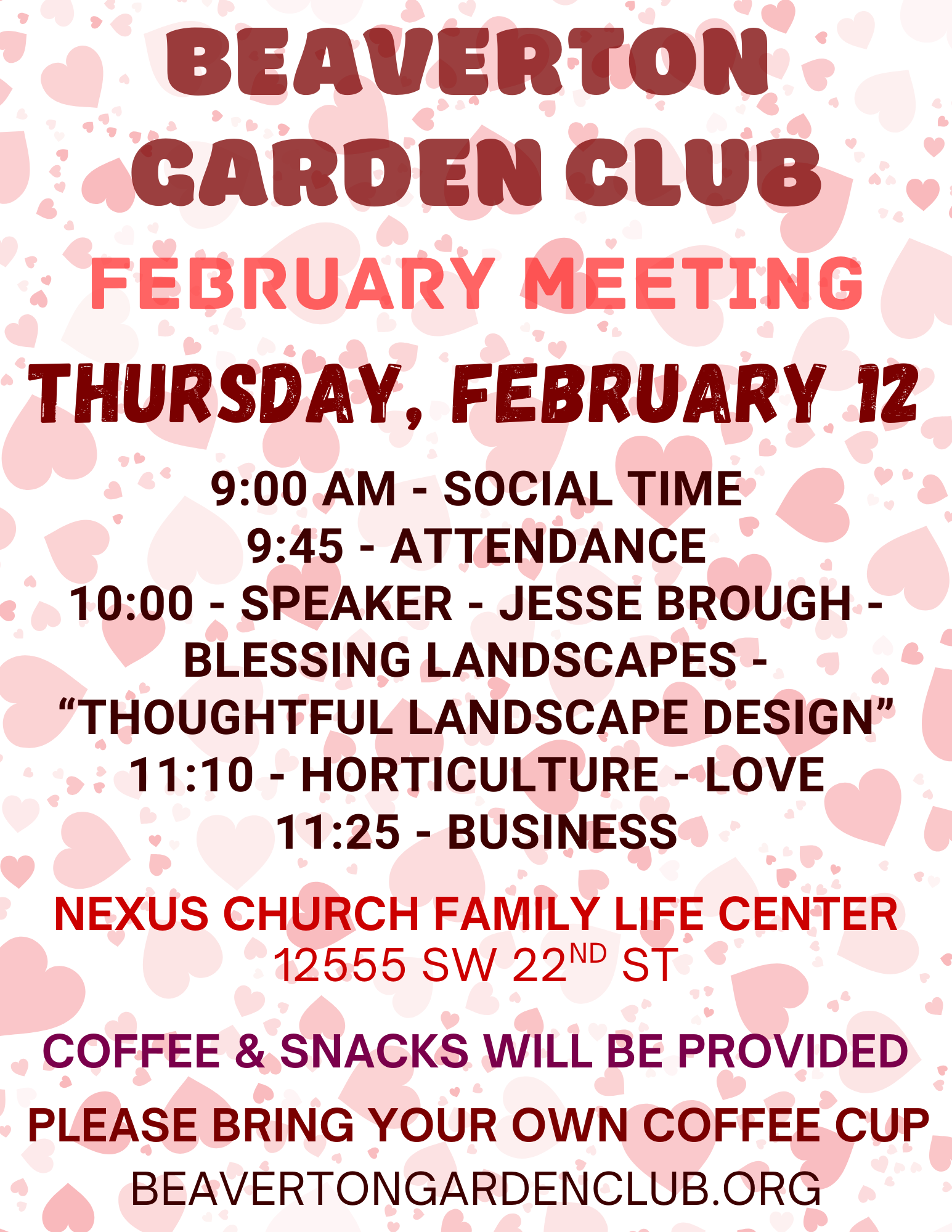 Our Garden Club is located in Beaverton, OR, with members from across the Beaverton area, including Beaverton, Aloha, Tigard, Hillsboro, Portland, and Lake Oswego. We are a member of the Pioneer District, Oregon State Federation of Garden Clubs, the Pacific Region of Garden Clubs, and the National Garden Club.