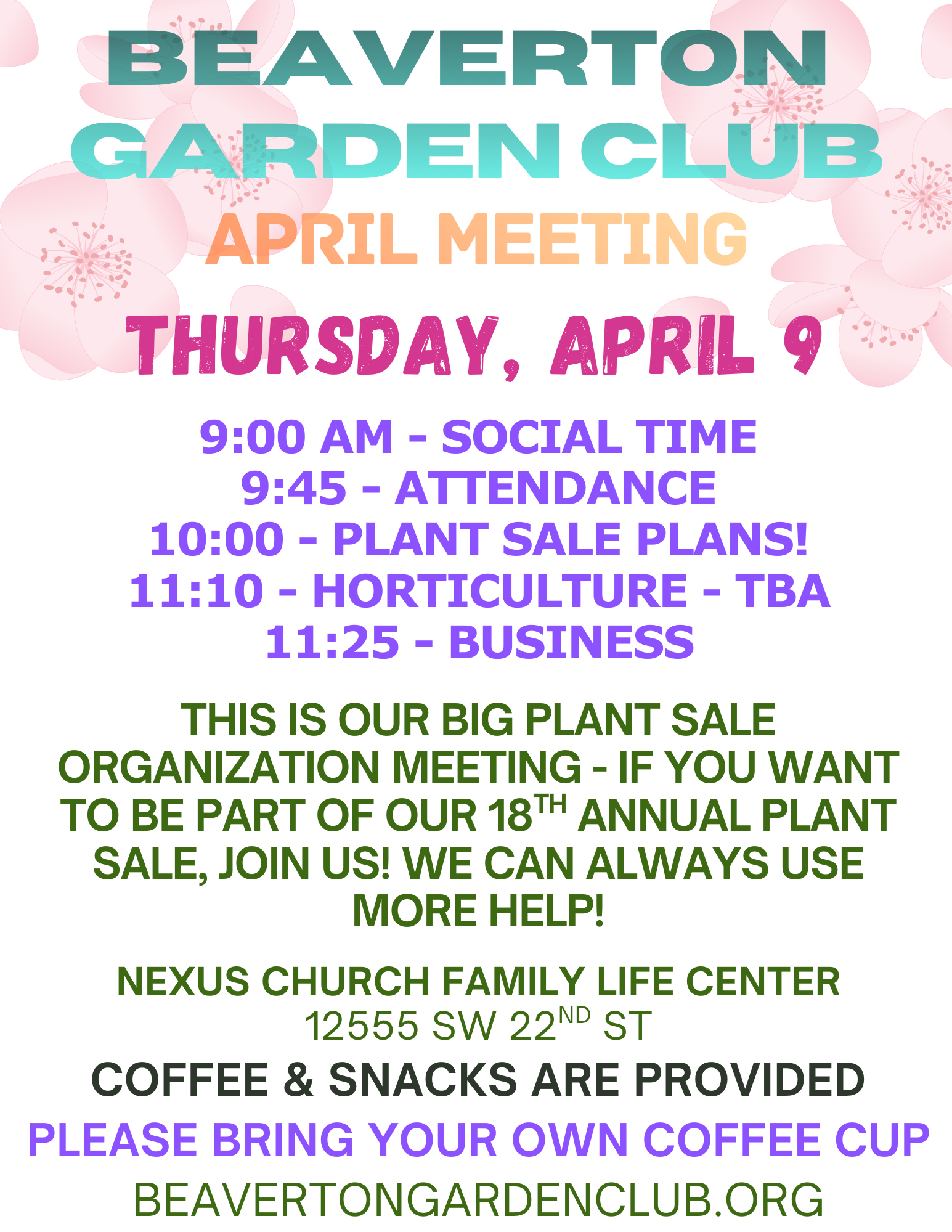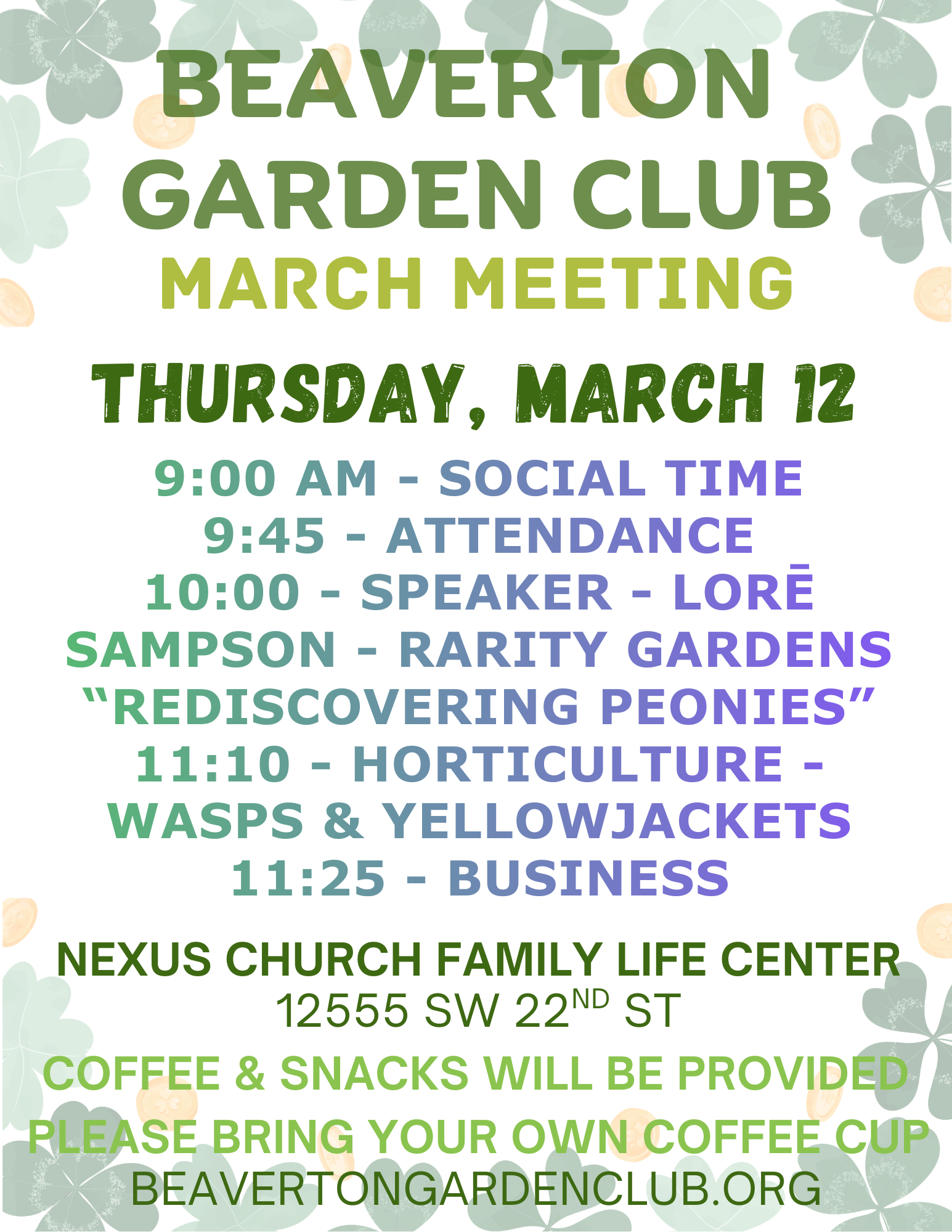 Our Garden Club is located in Beaverton, OR, with members from across the Beaverton area, including Beaverton, Aloha, Tigard, Hillsboro, Portland, and Lake Oswego. We are a member of the Pioneer District, Oregon State Federation of Garden Clubs, the Pacific Region of Garden Clubs, and the National Garden Club.