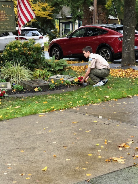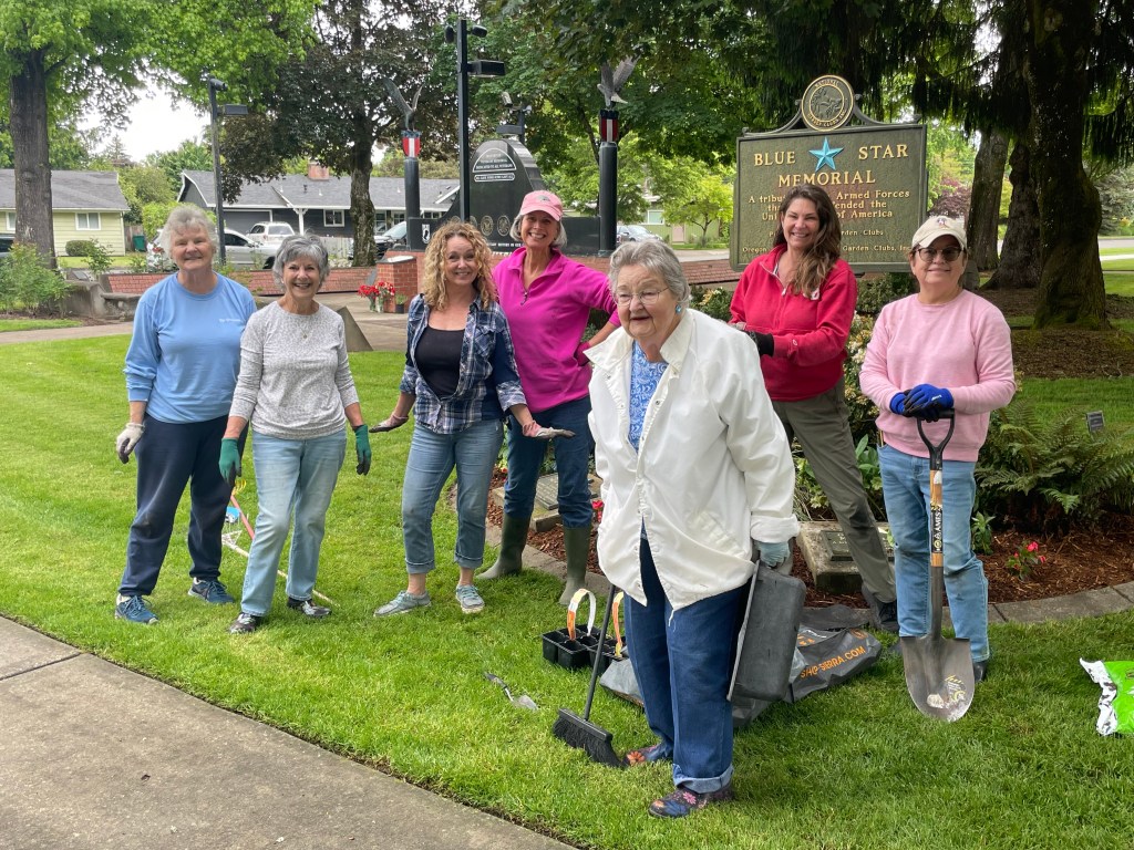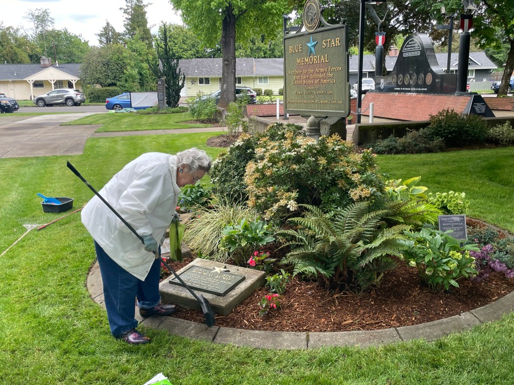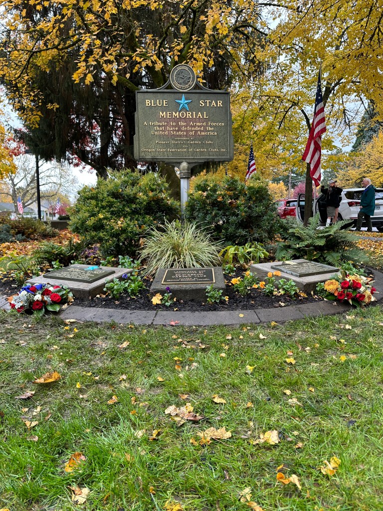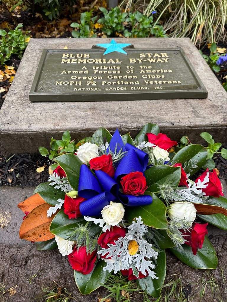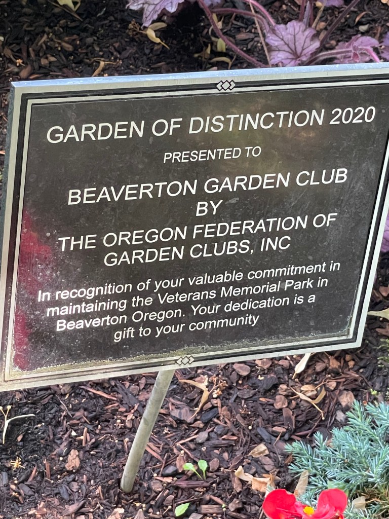 Also attending were Oregon State President Carolyn Olley, Oregon State Parliamentarian Mike Stewart, Oregon State Past President Gaye Stewart, celebrant Ernie Claeson, a Color Guard including Eagle Scouts from Beaverton Scout Troop #618,and many members of the Beaverton Garden Club and several others. Denise Tomasovic was the soloist and sang “God Bless America” as the church bells nearby rang at 11:00.