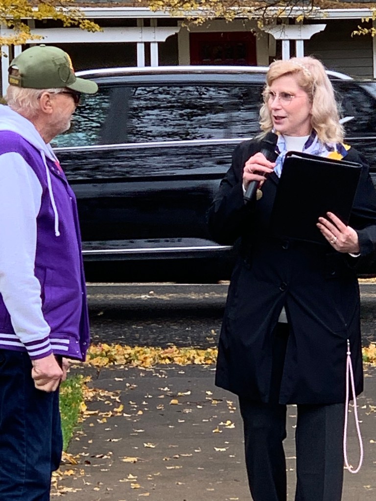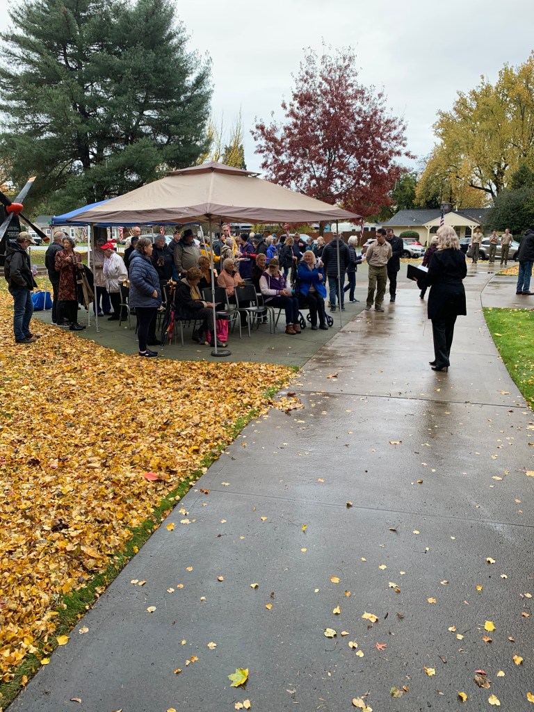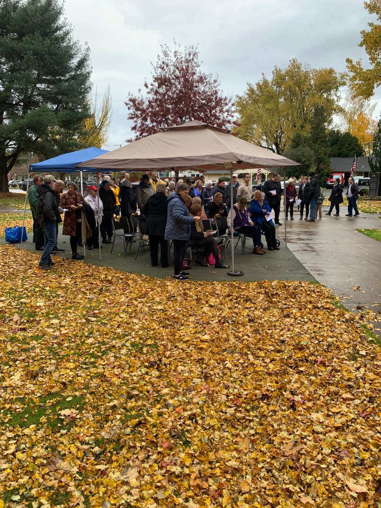 There was a dedication ceremony on Saturday, November 11, hosted by Beaverton Garden Club. Speakers included Beaverton Mayor Lacey Beaty, an Iraq War veteran; Jeff Keller, manager of the USO at PDX Airport, whose son was killed by enemy fire in Afghanistan in 2012; and Todd Swanson of the Military Order of the Purple Heart division of the American Legion.