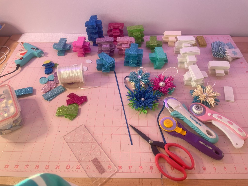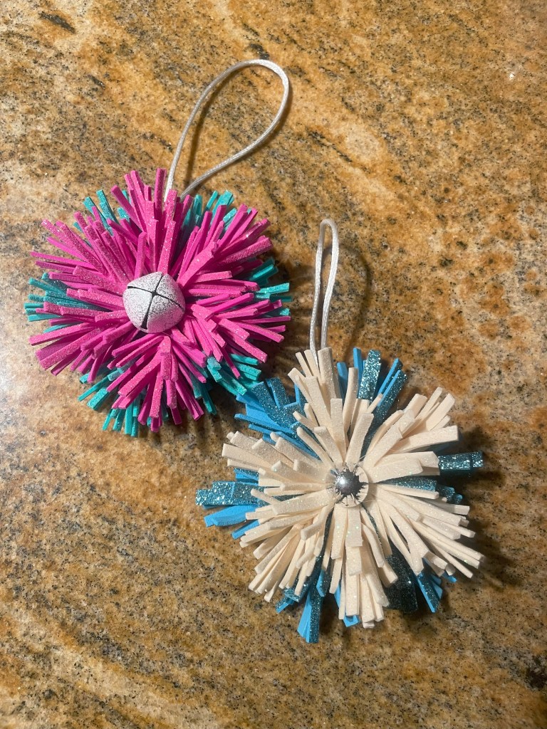 Glittery craft foam sheets were gradually turned into sparkling snowflake ornaments that could be used for decorating trees, wreaths, gifts, and much more.